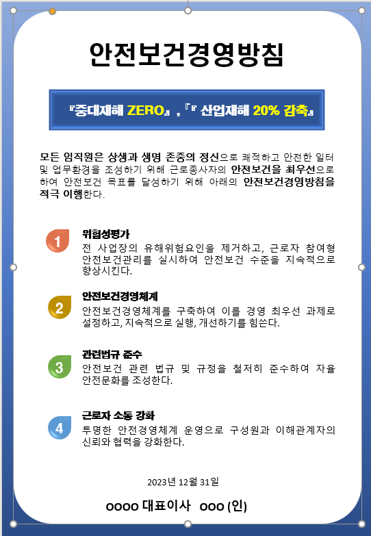 | 중대재해처벌법 안전보건경영방침 워드 파일 샘플 (2) | 2023.12.19 |